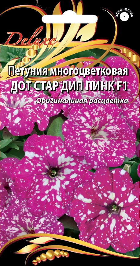 Уникальный гибрид новейшей серии «Дот Стар F1». Эту серию отличает от других наличие белых крапинок и пятен на основной окраске. При жаркой или изменчивой погоде меняется форма, частотность и интенсивность белых рисунков на лепестках так, что каждый цветок является неповторимым оригиналом. Растения высотой 30-35см, сильно ветвятся и обильно цветут. Цветки насыщенно розовые с белыми крапинками и пятнышками, диаметром 6-7см. Цветет обильно с июня до заморозков. Растение свето- и теплолюбивое, засухоустойчивое. Отличается устойчивостью к неблагоприятным погодным условиям. Быстро восстанавливает цветение после сильного дождя. Используют для клумб, рабаток, балконных ящиков и контейнеров.